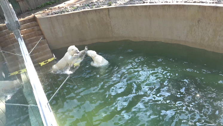 В Новосибирске белые медведицы Белка и Стрелка устроили водный бой на глазах у посетителей зоопарка. Драку косолапых в бассейне удалось снять постоянному посетителю зоопарка Сергею Ильтякову, видео он опубликовал на своей личной странице в социальной сети. На кадрах видно, как одна из любимиц публики подплыла к сестрице и начала водную борьбу. Медведицы выныривали по пояс и начинали бороться, стараясь «потопить» друг друга. Зачинщица ссоры после короткого поединка отплыла в сторону, но быстро вернулась и принялась снова нападать на сестру. К концу шуточного боя одна из медведиц поднялась на пару ступеней и оттуда спрыгнула на соперницу, после чего быстро ретировалась. Белка и Стрелка родились 16 декабря 2022 года. Однако о том, что покорившая тысячи сердец по всей России белая медведица Герда произвела на свет двух детенышей, стало известно лишь 7 февраля 2023 года. Сотрудники зоопарка установили камеры внутри вольера, чтобы следить за процессом выхаживания и подрастания двух новых мед