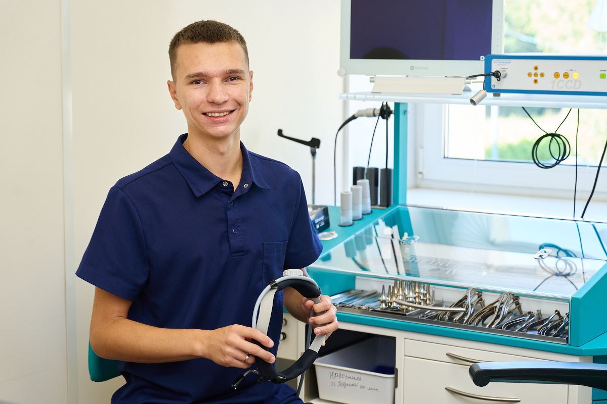 Алексей Андреевич — из тех врачей, кто постоянно учится: в университете он написал четыре научные работы, состоял в студенческом научном обществе, участвовал в конференциях, а будучи ординатором, выступал с докладами. Сейчас он постоянно читает свежие медицинские статьи и проходит онлайн-курсы. В его планах – стать еще и сурдологом, чтобы глубже работать со слухом, пройти курсы по эндоскопии и патологиям гортани, а также получить вторую квалификационную категорию и улучшить свои практические навыки хирурга.