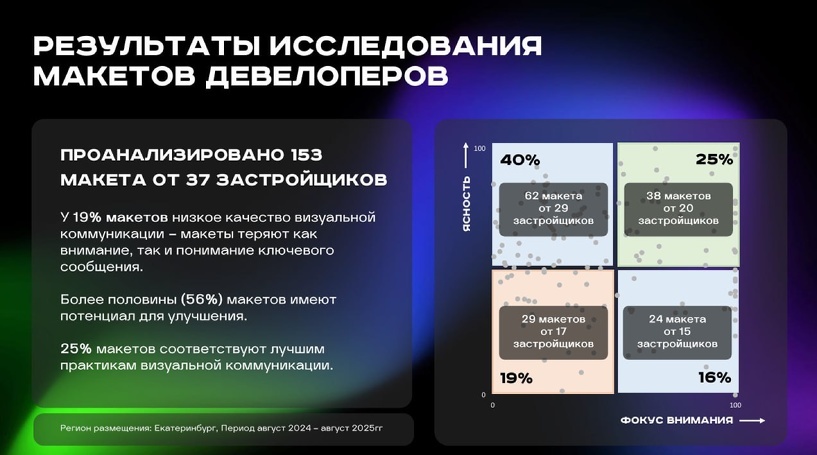 Рекламная группа «Арифметика» исследовала эффективность наружной рекламы, которую застройщики размещали с августа 2024 года по август 2025 года. Специалисты при помощи платформы SenseMachine проанализировали 153 рекламных макета от 37 строительных компаний и выяснили, насколько наружная реклама эффективна. Результатами исследования с 66.RU поделились Be Brand People. Искусственный интеллект (ИИ), который обучили на основе того, как работает человеческое внимание, пришел к выводу, что только 25% макетов четко передавали сообщение и вызывали интерес. Еще 56% требуют серьезной доработки. Оставшиеся 19% полностью провалили оба критерия — такие макеты не замечают и не понимают. По словам основателя SenseMachine Владимира Марголина, главные ошибки — перегруженность деталями, отсутствие визуального акцента и «слепые зоны», на которые никто не обращает внимания. За год застройщики потратили на наружную рекламу 534 млн рублей. Если 75% макетов оказались неэффективными, застройщики потратили впу