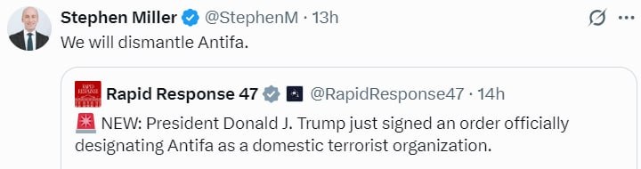 WH Advisor Stephen Miller says it’s TIME TO ‘DISMANTLE ANTIFA’ Posting Trump’s official executive order under which the movement now labelled as ‘domestic terrorist organization’
