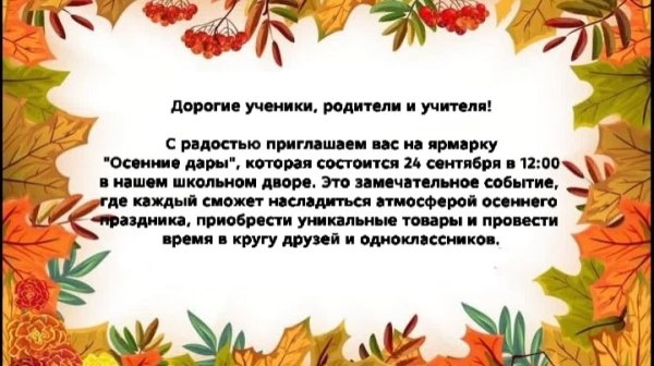 ПРИГЛАШАЕМ ГОСТЕЙ НА ОСЕННЮЮ ЯРМАРКУ! 24 сентября пройдёт школьная ярмарка «Осенние дары» Место проведения: ул. Первостроителей д. 11 а, школьный двор Источник https://uchaly102.ru/?p=101448