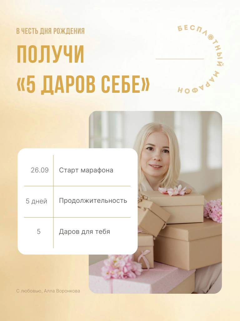 В честь моего Дня Рождения я хочу сделать особенный подарок – провести для тебя бесплатный марафон «5 Даров Себе» ⠀ Старт уже через 3 дня, и это будет настоящая трансформация! 5 дней – 5 подарков, которые помогут тебе раскрыть любовь к себе, зарядиться энергией, обрести свободу, научиться осознанности и подарить своему телу здоровье. ⠀ Я поделюсь эффективными практиками, которые помогают мне самой жить полной и счастливой жизнью. Это мой способ сказать тебе спасибо за поддержку. Марафон будет проходить а моем Телеграм канале «Голос Души с Аллой Воронковой». ⠀ Не упусти ценную возможность – сделать свою жизнь еще лучше. Подписывайся на мой Телеграм Приглашай своих друзей. Пусть в мире будет больше здоровых и счастливых людей!