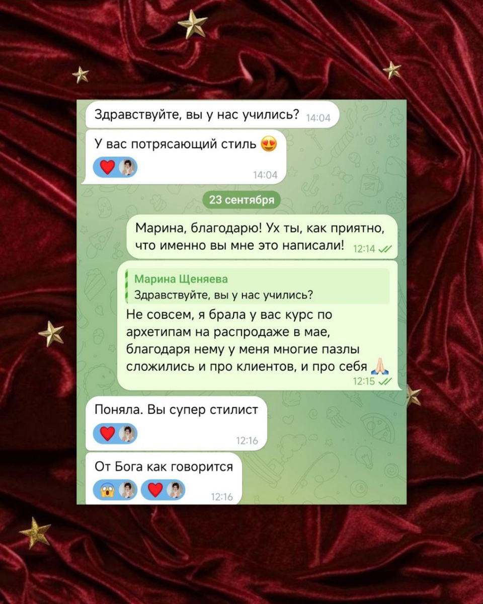 Восторг, который сложно уместить в рамки! 🦋 Комплименты от друзей и подписчиков — это приятно. Но когда тебя отмечают мэтры индустрии… вот тогда понимаешь: делаешь что-то по-настоящему важное. На днях мне написала сама Марина Щеняева — стилист, брендмейкер, создатель школы стиля и автор метода определения архетипов по дате рождения. И знаете что? Я пищала от счастья. Потому что именно этот метод когда-то: 🤎 прокачал мой личный стиль, 🤎 помог десяткам моих клиенток (не говоря уже о тысячах клиенток и учениц Марины) перестать «прятаться» за одеждой и показать миру свою истинную энергию. 💙 И вот теперь вопрос к вам, красавицы: 🌖А вы уверены, что ваш гардероб отражает именно ВАС? 🌖Знаете ли вы свои архетипы? 🌖Если я когда-то их для вас разбирала — расскажите в комментариях, как это изменило ваш стиль и ощущение себя. Только честно! 🎀 А может, вы до сих пор не верите, что пару цифр в дате рождения могут так круто влиять на образ? Давайте обсудим ⬇️