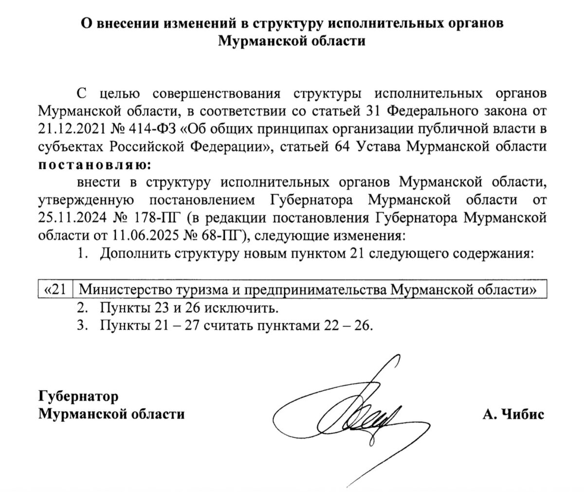 В ответ на пост #Официально@AoMurmansk: Губернатор оперативно подписал постановление, сокращающее две структурные единицы областного правительства. Этим же постановлением в структуру добавлено объединённое Министерство туризма и предпринимательства. ❄ «Арктический Обозреватель»