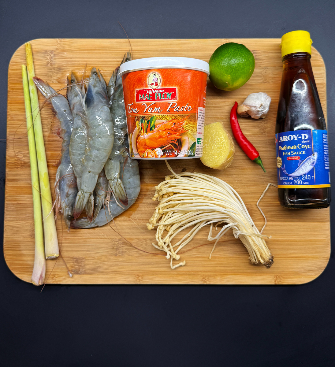 ➖Вода — 3 л Начнём с бульона. Можно и на курином, но на рыбном выходит быстрее, а я сегодня голодный. Всё закинуть в кастрюлю, залить холодной водой, довести почти до кипения, выключить и дать настояться. Потом процедить. Том Ям