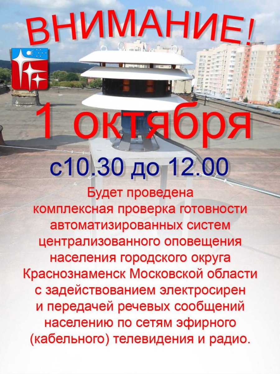 Уважаемые жители Краснознаменска! 1 октября с 10:30 до 12:00 будет проведена комплексная проверка готовности автоматизированных систем централизованного оповещения населения с задействованием электросирен и передачей речевых сообщений населению по сетям эфирного (кабельного) телевидения и радио. Просьба сохранять спокойствие.