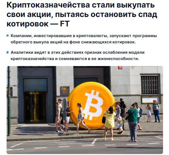 Компании, инвестировавшие в криптовалюты, запускают BUYBACK (программы обратного выкупа акций) в попытке поддержать свои котировки. Это очередной признак того, что ажиотаж вокруг модели «криптовалютного казначейства» в этом году начал сдуваться Среди компаний, столкнувшихся с трудностями, производитель гольф-каров и разработчик онлайн-игр. Они начали активно скупать криптовалюту два месяца назад, а теперь вынуждены прибегать к выкупу собственных акций, чтобы поднять падающие котировки. Некоторые даже влезают в долги ради этого. Подобные шаги за последние недели предприняли по меньшей мере 7 компаний. Капитализация 5 из них опустилась ниже стоимости криптовалютных активов на их балансах — по мере того, как у инвесторов растут сомнения в устойчивости бизнес-модели криптоказначейств и обеспокоенность перенасыщением рынка. «Для некоторых это, возможно, уже предсмертные судороги», — считает старший аналитик Kaiko Адам Морган Маккарти. «Они просто пытаются выиграть время, поддержать бизнес