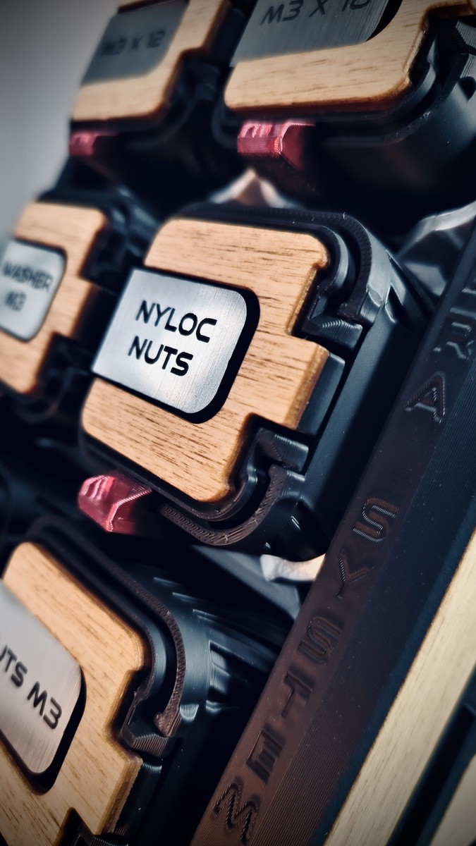 Я уже тут писал, что делаю систему хранения под 3д печать. Вот тут. Для ЛЛ лени, выглядит она так: Но у меня есть лазерный станок! И вот решил я попробовать ещё несколько идей. Взял я пропитку для дерева, с наночастицами пигмента, твёрдым воском и маслом сакуры с восточного склона Фудзиямы, и решил провести эксперимент. Покрасил, вырезал, отгравировал надписи. И получились вот такие вставки: Это фанера, 3мм, ФК, сорт 1/2. Но я её шлифовал, потом втирал масло, в два слоя, и потом ещё полировал войлочным кругом… В общем — лухари. Выглядит и ощущается как какое-то дорогое дерево. Но передать на фотографиях я не смог, прастити. Есть ещё дубовый шпон, тоже 3мм, и я собирался делать из него. Но это весьма капризный материал. Его гнёт от влаги, он плохо шлифуется, но самое главное — дуб плохо смотрится. Узор древесины хорошо выглядит на большой площади, но не на мелких элементах. Из представленных образцов остановился на «золотом дереве». Эбеновое дерево смотрится как грязь, а Каберне — слишк