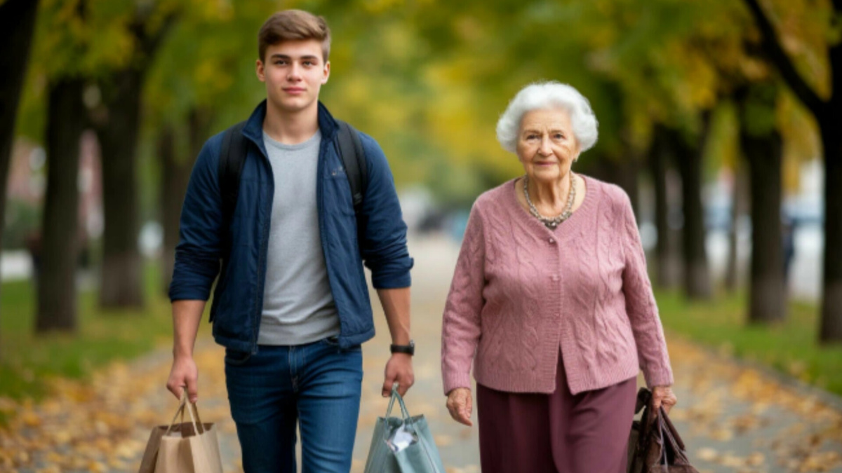 В это время из автоматических дверей супермаркета вышла женщина лет сорока пяти — полная, с добрым, усталым лицом. В руках у неё было множество тяжёлых пакетов, и она явно с трудом справлялась с ношей. Позже она представилась как Анна Сергеевна — женщина, выглядевшая воплощением русской женщины, привыкшей нести на своих плечах весь мир, не жалуясь и не ожидая благодарности. На ней была простая, но чистая одежда, удобная обувь для долгой ходьбы, а в глазах светилась та особенная доброта, что не выученная, а природная.