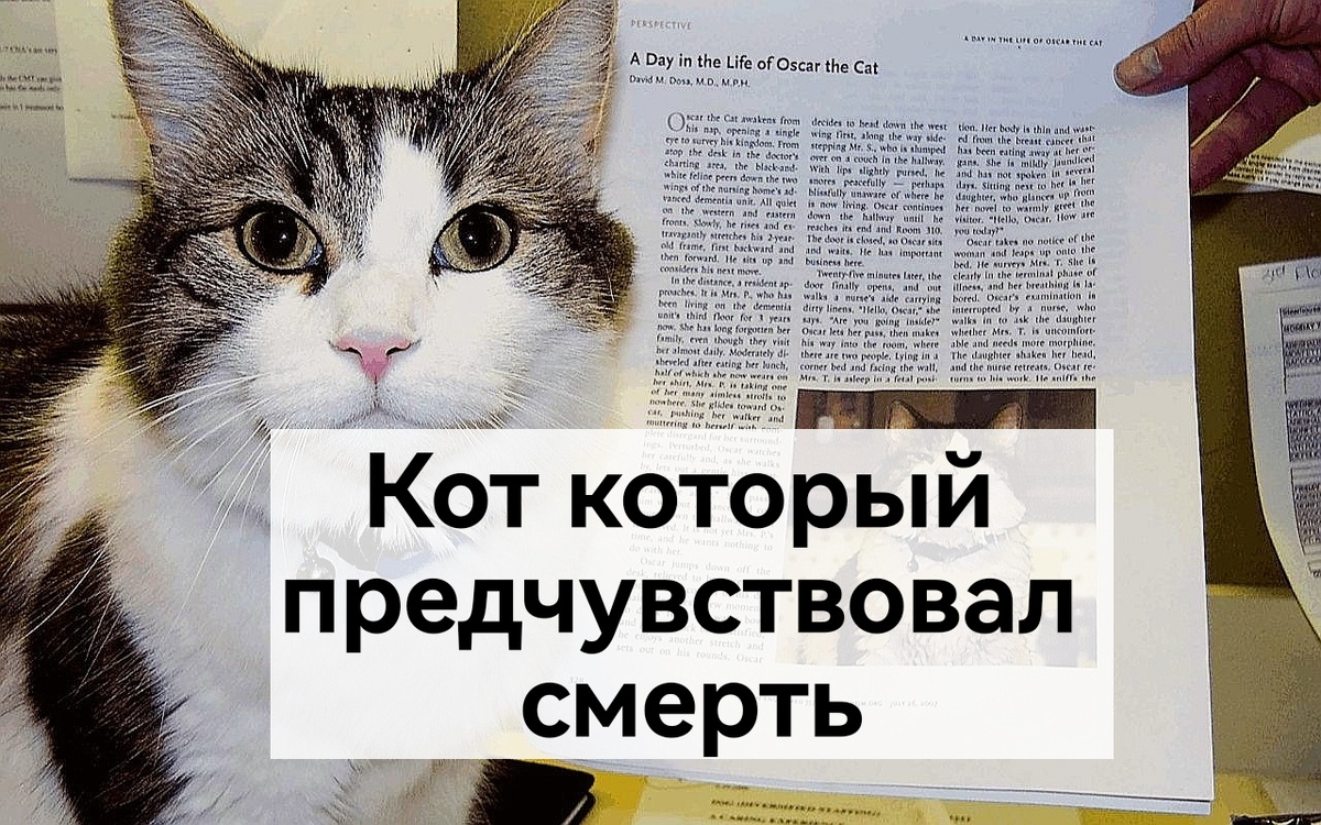 История кошки по имени Оскар, которая придугадывала смерть пациентов потрясло весь мир и до сих пор остаётся реальным феноменом, учёные до сих пор строят версии и научные объяснения 25 подтверждённым случаям- когда кошка ложилась у пациента и тот вскоре умирал.
