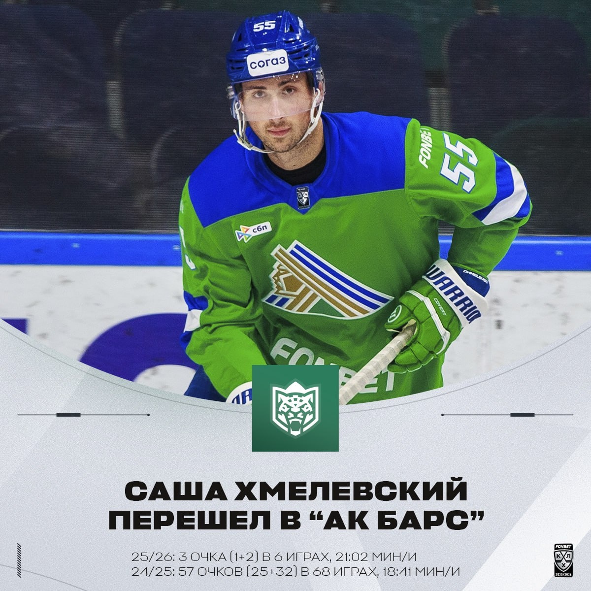 🟢 Саша Хмелевский теперь другой «зеленый»! Нападающий перешел в «Ак Барс» в обмен на денежную компенсацию и защитника Уайатта Калинюка (2 игры, 0 очков, -1).