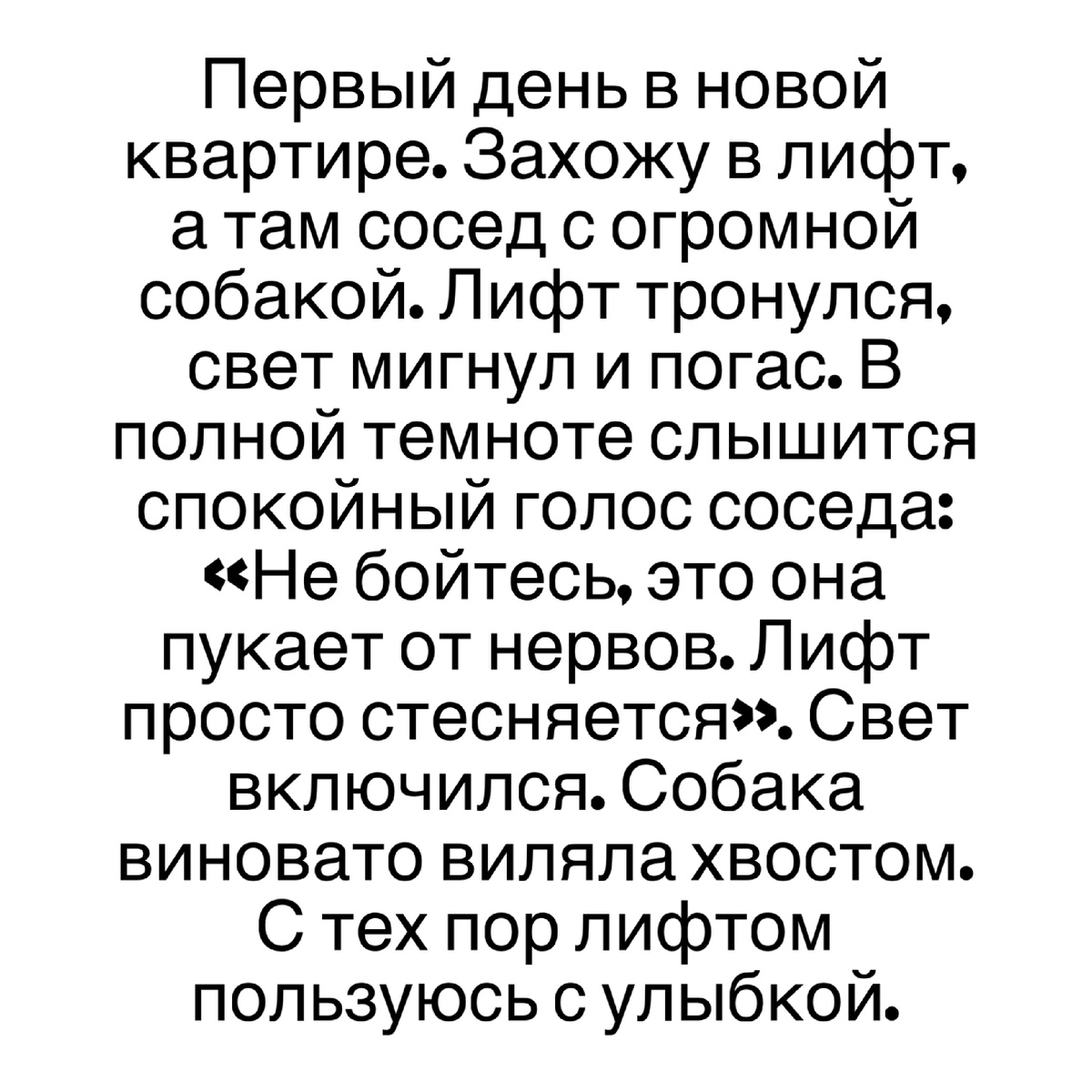1. Боевое крещение лифтом Первый день в новой квартире. Захожу в лифт, а там сосед с огромной собакой. Лифт тронулся, свет мигнул и погас. В полной темноте слышится спокойный голос соседа: «Не бойтесь, это она пукает от нервов. Лифт просто стесняется». Свет включился. Собака виновато виляла хвостом. С тех пор лифтом пользуюсь с улыбкой. 2. Кулинарный перфекционизм кота Мой кот — гурман. Обычную еду он игнорирует, но однажды унюхал пармезан. Теперь перед тем как есть, он тщательно обнюхивает миску, оттаскивает лапой неугодный кусок, а потом смотрит на меня с упреком. Кажется, скоро он потребует меню и сомелье. 3. Диалог на детской площадке Две мамы на скамейке увлеченно обсуждают, какую развивающую методику выбрать для ребенка. В это время их дети (лет 3) в песочнице с ожесточением делят совок. Один громко заявляет: «Мой совок! Я его вчера лизал!». Спор был мгновенно решен в его пользу. Аргумент железный. 4. Криптограф в супермаркете Пожилая пара передо мной в очереди долго из