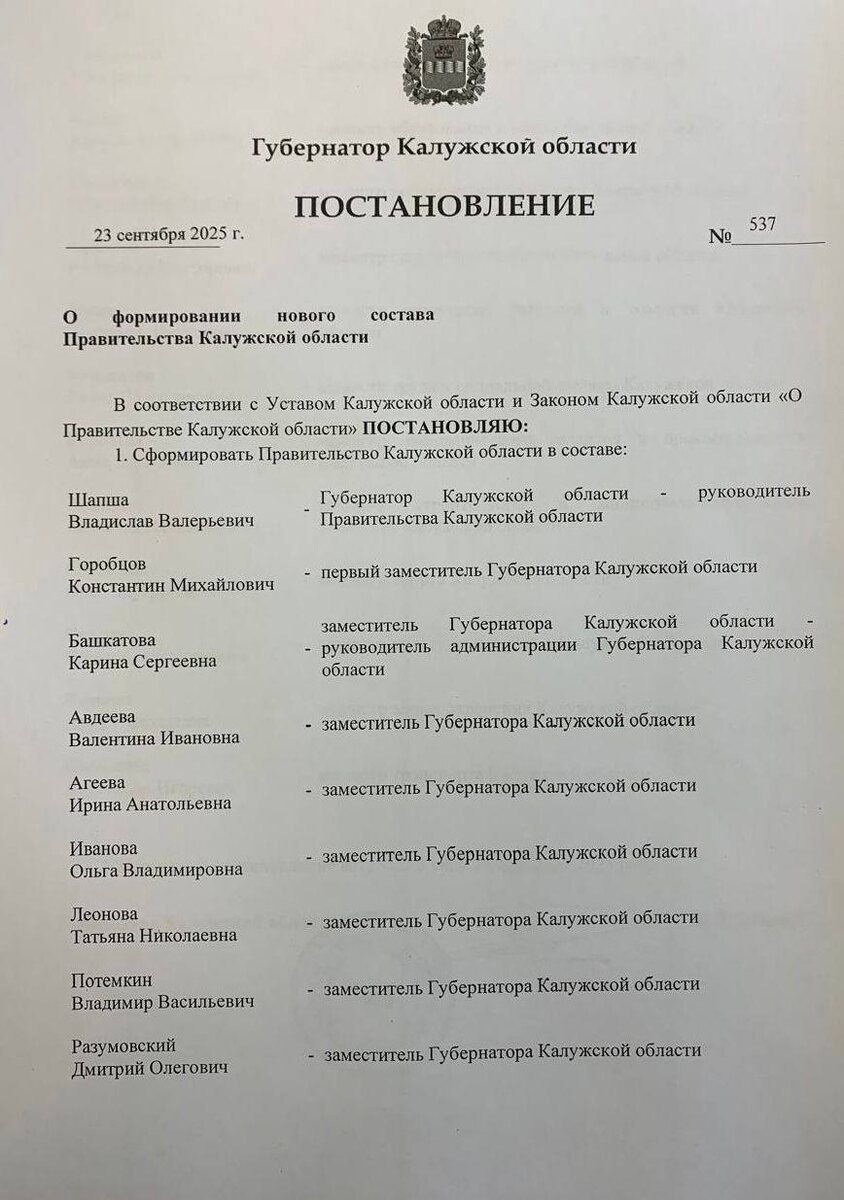 📋 Владислав Шапша утвердил новый состав Правительства Калужской области Изменения коснулись ряда должностей, сообщил губернатор. 😁Горобцов Константин Михайлович — Первый заместитель губернатора Калужской области. Его зона ответственности - реализация национальных и региональных проектов. 😁Агеева Ирина Анатольевна — заместитель губернатора Калужской области. Будет отвечать за весь социальный блок. 😁Королева Анна Борисовна назначена министром экономического развития и промышленности Калужской области 😁Лежнин Вячеслав Вячеславович возглавит министерство строительства и ЖКХ региона 😁Шпиренко Александр Игоревич — министр транспорта Калужской области 😁Возложил исполнение обязанностей министра внутренней политики области на Гурова Кирилла Александровича. "В состав Правительства Калужской области не вошел Владимир Попов. Желаю Владимиру Игоревичу дальнейших успехов. Кабинет министров региона также покинул Олег Калугин. Его ждет важная и интересная работа. Все остальные члены Пр