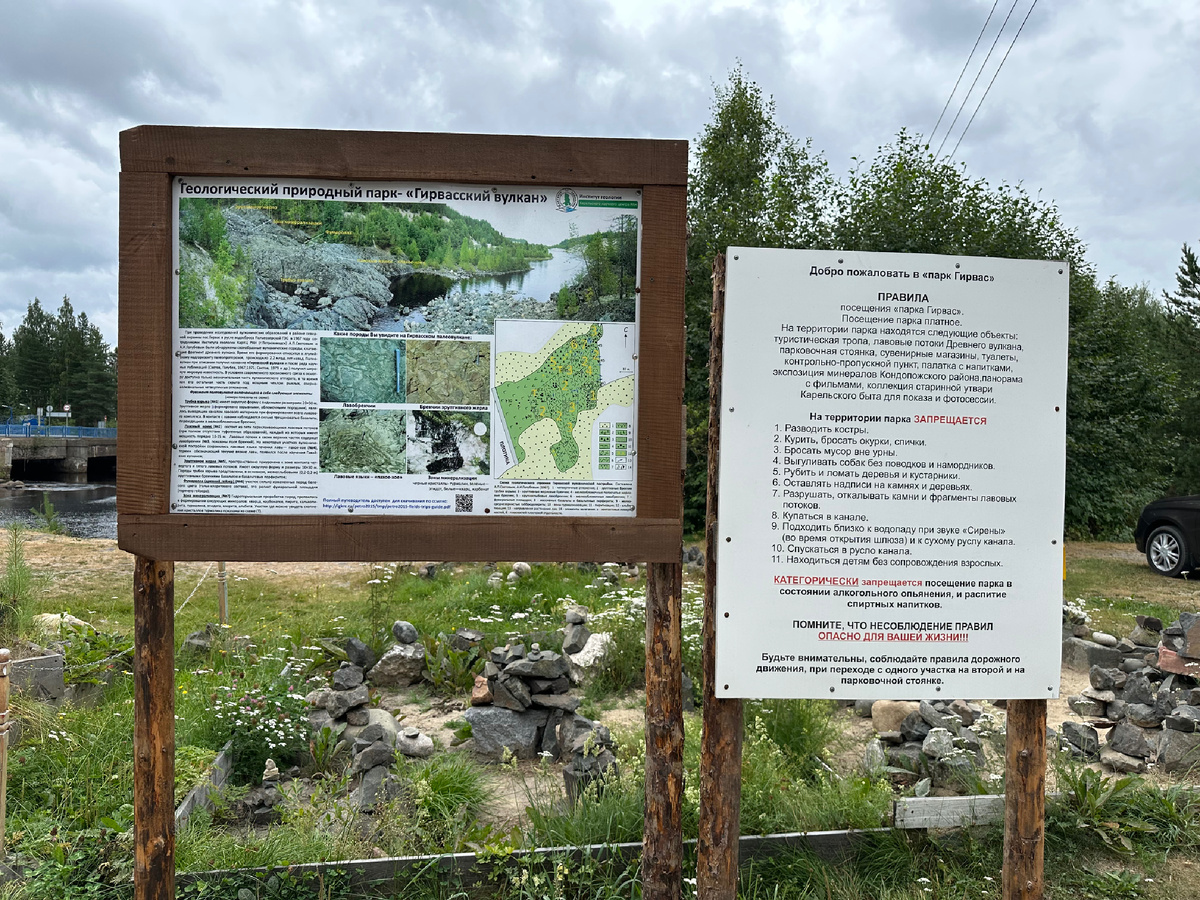 В 12 часов дня мы были в Кондопожском районе, нашей следующей остановкой стал Геологический природный парк «Гирвасский вулкан». Находится он неподалёку от посёлка Гирвас, в русле реки Суна. От посёлка до вулкана - около 2,5 километров. Расстояние на машине от Медвежьегорска - 77 км, время в пути около часа.