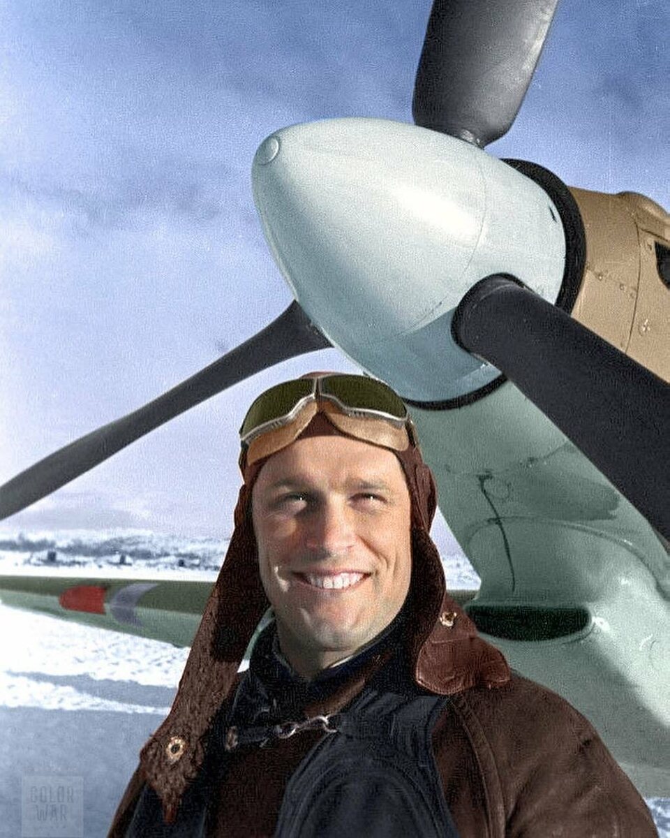 "Истребитель Сафонова, теряя высоту и скорость, шёл по направлению к конвою. Не дотянув примерно две мили до эскадренного миноносца «Валериан Куйбышев», он упал в море и тут же исчез в волнах. Эти последние минуты полета наблюдали моряки с советских кораблей." / Хаметов М. И. В небе Заполярья. На фото Борис Феоктистович Сафонов у истребителя «Харрикейн» Мк IIВ на аэродроме Ваенга-1. Один из наиболее результативных советских асов первых месяцев Великой Отечественной войны. Обстоятельства смерти не удалось прояснить до сих пор – командир 2-го гвардейского ИАП не вернулся из боевого вылета 30 мая 1942 г. по защите судов конвоя PQ-16, который с военными грузами шел в СССР из Рейкьявика. Или подполковник Сафонов был сбит оборонительным огнем стрелка бомбардировщика, или совершил вынужденную посадку на воду и погиб в ледяной воде из-за отказа мотора «Киттихаука». На пределе🔥