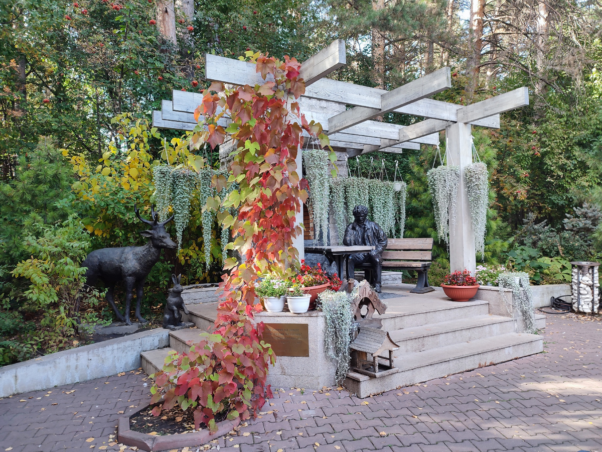 Возле Лебединого озера сидит, теперь уже всегда, первый директор и создатель зоопарка - Ростислав Шило. В окружении своих любимых подопечных. С 1969 по 2016 он возглавлял и развивал всё зоопарковое хозяйство, поэтому теперь и сам зоопарк носит его имя. Сейчас директором работает его сын, и дочь здесь же - по ветеринарной части. Сам Ростислав по профессии тоже был ветеринар, и в таком качестве первый раз пришел на работу в зоопарк (тогда еще на старом маленьком месте).