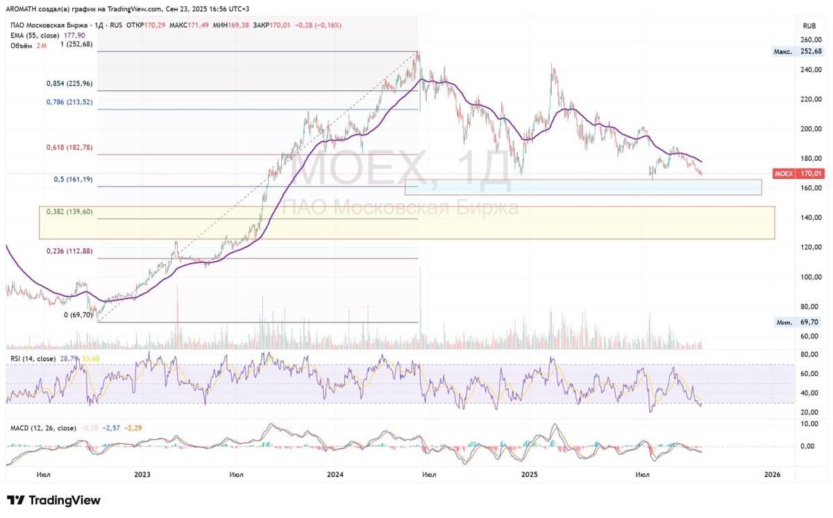 Акции Мосбиржи ни сейчас, ни тем более на выносе год назад по исполненному прогнозу 230-260 не представляют интереса.