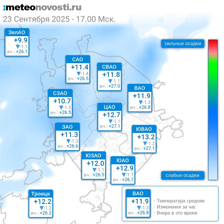 В 17:00 в Москве было от +9.8°C до +13.3°C, средняя температура +11.8°C #погода #Москва #осень #температура #23сентября #вторник