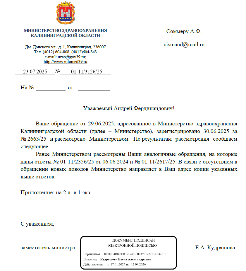 28 февраля 2025 года мной была вызвана скорая помощь для моей матери, проживающей в Балтийске. Сам я живу в Калининграде, а моя матушка за последний год была 7 раз госпитализирована в БСМП, в том числе экстренно, так как была угроза для ее жизни в связи с камнями в единственной почке и мочевыводящих путях. 28 февраля у нее сильно поднялась температура, появились значительные отёки. Скорая не приехала за 4 часа, хотя это было дневное время. При неоднократных звонках нам сообщали, что скорая помощь вот-вот приедет, либо что скорая помощь едет издалека, либо что имеется недостаток бригад скорой помощи. В итоге вызов пришлось отменить, так как ночью моя мать ехать в БСМП не планировала, но, к счастью, в итоге всё обошлось. В своём предыдущем обращении я просил провести проверку и сообщить, является ли данная задержка прибытия бригады скорой помощи нарушением действующего законодательства, ведь жизни моей матери пенсионного возраста (при этом являющейся инвалидом 3-й группы) была создана не