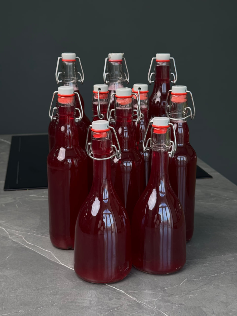 Базилик в процессе варки становится болотным, теряет весь свой пигмент, но делает компот роскошного цвета. У меня для таких случаев есть бутылки с бугельным замком. Стоят недорого, а смотрятся на столе очень эффектно!