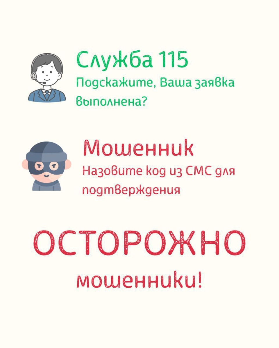 📛 ОСТОРОЖНО - НОВЫЕ СХЕМЫ ОБМАНА! На территории нашей страны участились случаи применения новых схем мошенничества. Злоумышленники звонят и представляются: - работниками службы 115; - работниками домофонных компаний. В обоих случаях под разными предлогами просят назвать код из СМС. 🚩БУДЬТЕ БДИТЕЛЬНЫ! Не сообщайте никому никаких сведений, полученных через сообщения. ℹ️ Сотрудники службы 115 всегда задают вопросы, касающиеся только выполнения оставленных ранее заявок и ни при каких обстоятельствах не торопят граждан дать тот или иной ответ! В случае, если кто-то, представившись сотрудником службы 115 или домофонной компании, требует от вас код - немедленно положите трубку! Если не уверены - вы всегда сами можете набрать короткий номер 115. 🚩 Распространите данную информацию среди родных и близких и сохраняйте бдительность!