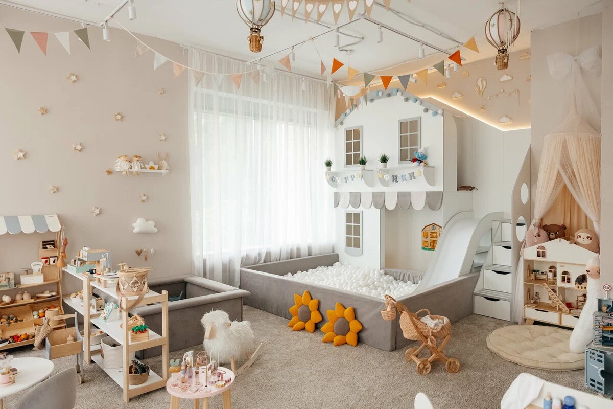 Главная звезда пространства — домик с горкой, созданный нашей студией. 🏠 Внизу — просторная игровая зона. Сюда легко поставить мини-кухню или столик для рисования.