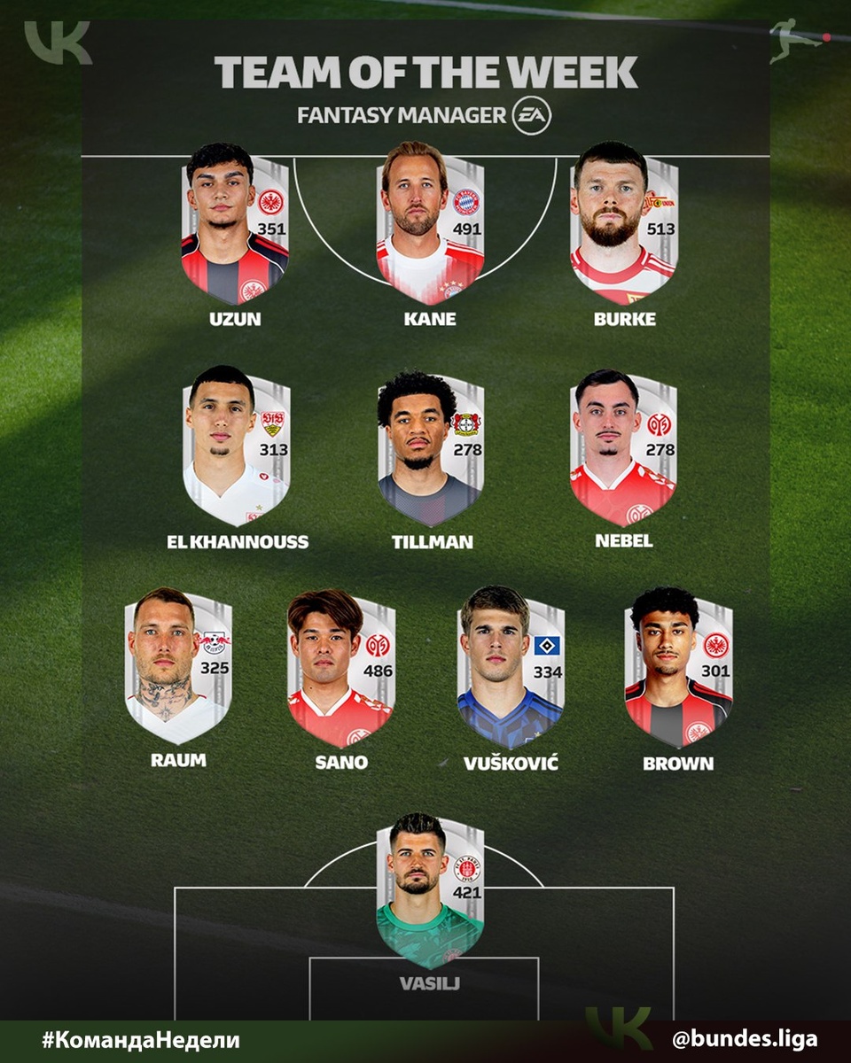 ⚡🇩🇪 Команда недели в Бундеслиге! 📝 Все результаты 4 тура: «Штутгарт» - «Санкт-Паули» - 2:0 «Гамбург» - «Хайденхайм» - 2:1 «Хоффенхайм» - «Бавария» - 1:4 «Вердер» - «Фрайбург» - 0:3 «Аугсбург» - «Майнц» - 1:4 «РБ Лейпциг» - «Кельн» - 3:1 «Айнтрахт» - «Унион Берлин» - 3:4 «Байер» - «Боруссия» (Менхенгладбах) - 1:1 «Боруссия» (Дортмунд) - «Вольфсбург» - 1:0 #Бундеслига