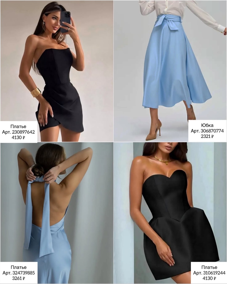 - Тихая роскошь: белый корсет 374412350 + сатиновая серая миди 241586347 + клатч 265161983; сверху — тонкий шарф-шелк.