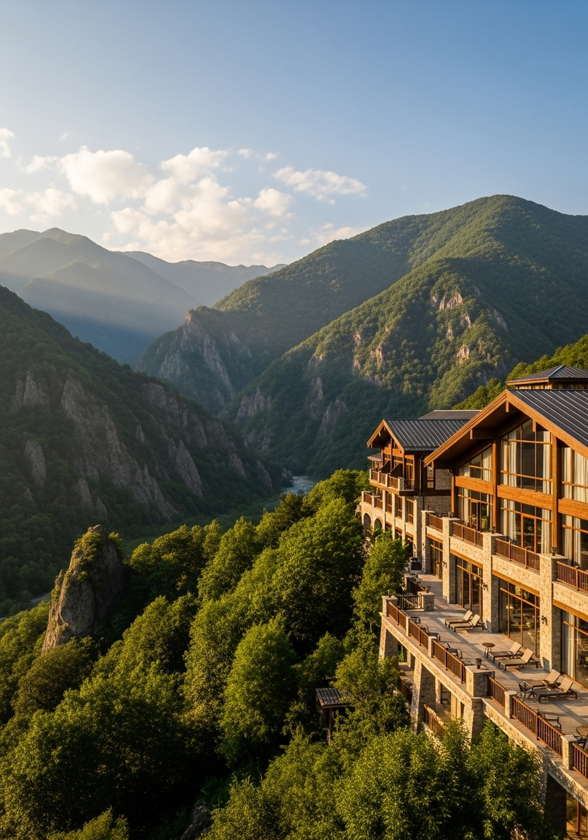 Отель располагается на высоте 670 метров над уровнем моря в окружении величественных гор, покрытых густыми лесами. Находится в непосредственной близости от Кавказского государственного заповедника, что делает его идеальной отправной точкой для горных походов и экскурсий.