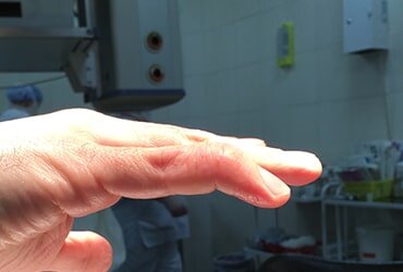Подкожный отрыв сухожилия разгибателя пальца на уровне дистального межфалангового сустава, деформация, при которой ногтевая фаланга сгибается и не может разогнуться. Это происходит за счет того, что происходит разрыв сухожилия разгибателя, располагающееся на тыльной стороне пальцев. Другой причиной может послужить перелом основания дистальной фаланги, именно поэтому всегда необходимо выполнять рентгенограммы поврежденного пальца перед лечением. Чаще всего причиной является травма пальца: ушиб, удар, падение. Иногда люди заправляют постель или выполняют другую привычную работу, после чего обращают внимание на согнутую фалангу и невозможность ее разогнуть. Ногтевая фаланга провисала, согнута, имеется отек, боль, изменение цвета. Разогнуть палец невозможно без помощи другой руки. В большинстве случаев это поддается консервативному лечению. Поврежденный палец фиксируют специальной шиной в течении 6-8 недель не снимая. Показанием к оперативному лечению является застарелые повреждения сухожи