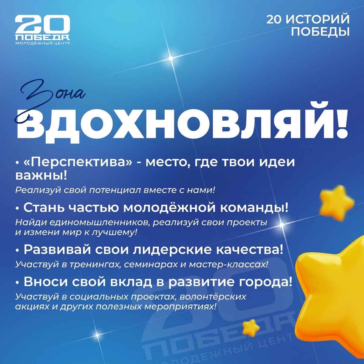 ✨ Привет! Еще не решил чем заняться в пятницу вечером? Приходи на 20-летие «Победы» и посмотри все зоны, которые мы для тебя подготовили! Ждем именно тебя! 📆 26.09.2025🕒17:00 🏢 Молодёжный центр "Победа" 📍 Домодедово, 30-Летия Победы пл., д. 2 ✅ Мероприятия Домодедово https://dzen.ru/id/66f10385cc4c5a16f7b5fb02 http://vk.com/domodedovo_events http://dzen.ru/domodedovo_events