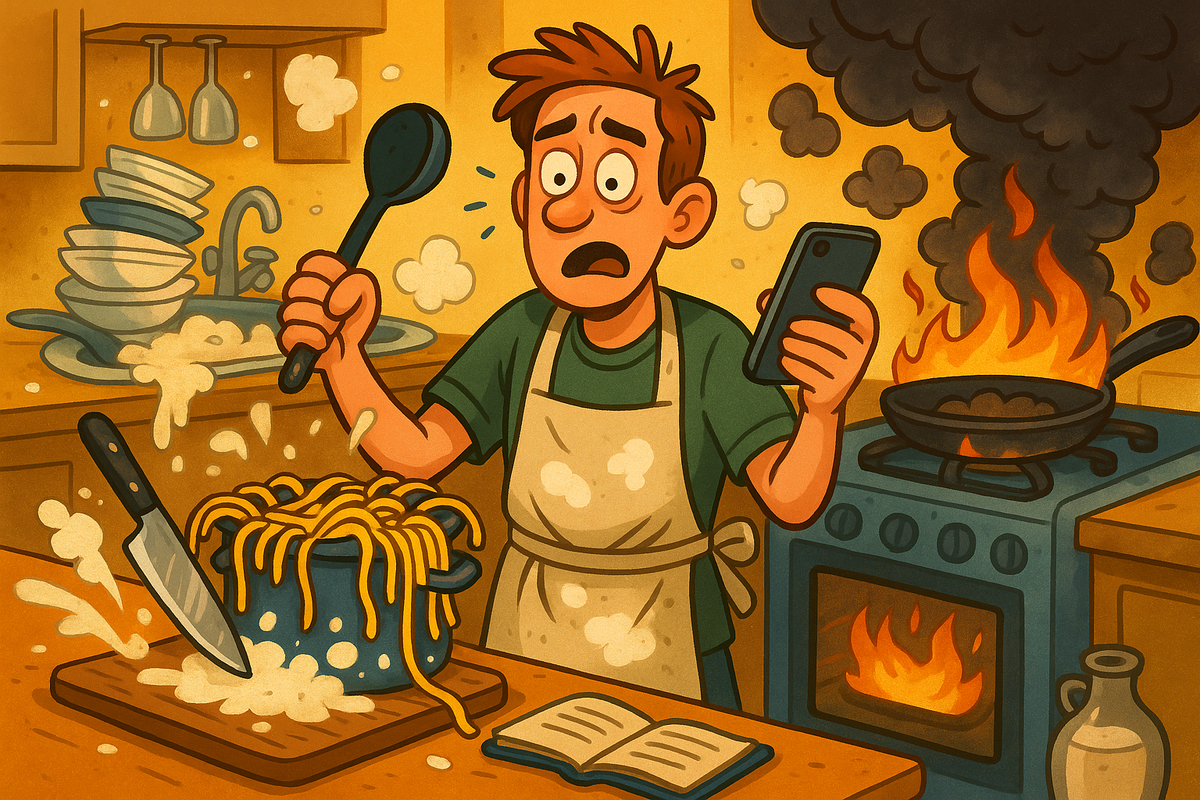 Кулинарные шоу уверяют: «Приготовить вкусный ужин легко!» Ложь. В реальности готовка — это битва, где ингредиенты против тебя. Ты берёшь рецепт из интернета: «Просто 15 минут». Проходит час, кухня в муке, сковородки горят, а результат похож на произведение современного искусства. Соль всегда сыплется больше, чем нужно. Макароны убегают из кастрюли. Картошка горит именно тогда, когда ты отвлёкся на телефон. А духовка ведёт себя как капризная дива: или всё сырое, или уголь. А ещё нож. В рекламе он режет помидор, как масло. У тебя он режет только палец. В итоге готовка превращается в аттракцион: много шума, мало еды и бесконечная гора посуды.