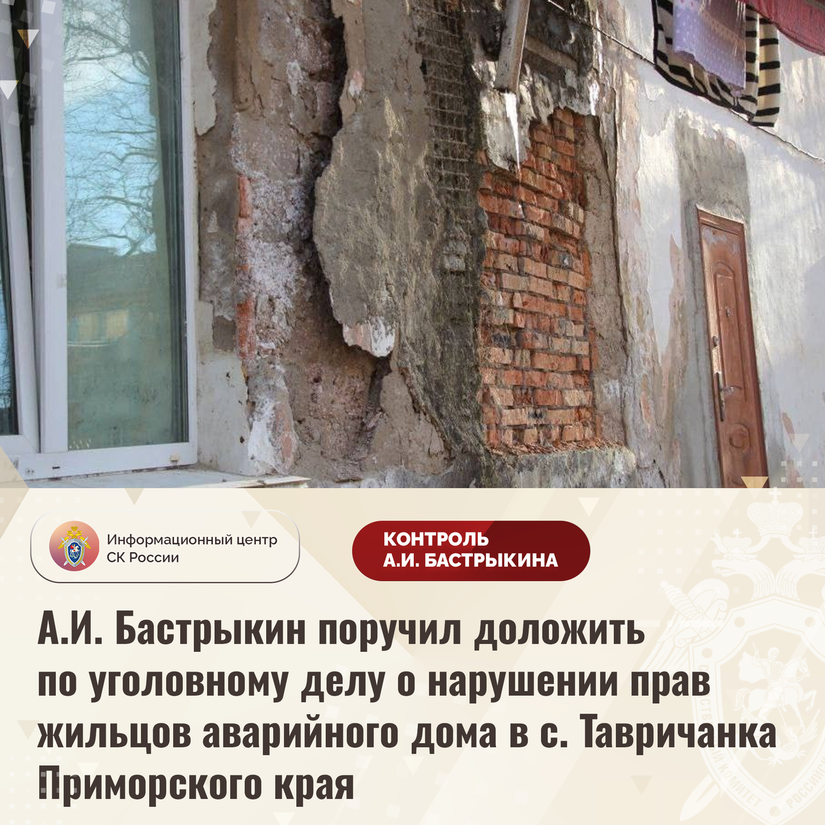 А.И. Бастрыкин поручил доложить по уголовному делу о нарушении прав жильцов аварийного дома в с. Тавричанка Приморского края