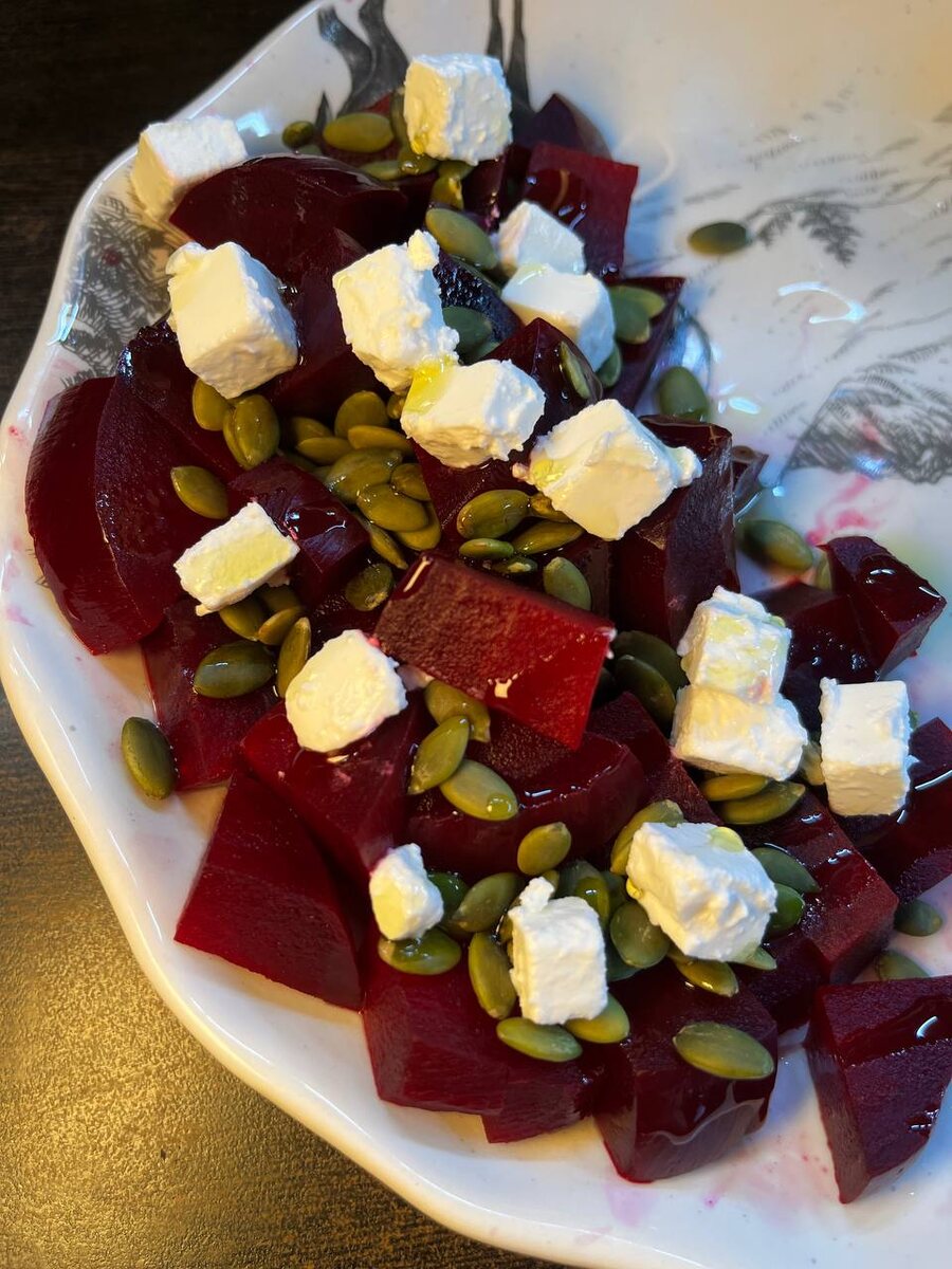 Если вы не знаете, что подать на гарнир — это лучший вариант. Салат со свеклой, оливковым маслом, орешками и фетой. Всё вроде бы понятно, но давайте расскажу по пропорциям. У меня было четыре большие свёклы. Я их варила час, они хорошо размягчились. У меня есть лайфхак с микроволновкой в профиле, но мне лично проще сварить. Варим в кожуре: достаточно обрезать верх и низ. После варки свёклу остужаем под холодной водой и чистим — кожица легко снимается даже руками. Сыр — брала «Сиртаки», одна упаковка идеально подходит на такое количество свёклы. Ещё добавила тыквенные семечки и оливковое масло. Дальше всё просто: нарезаем свёклу кубиками, сверху кладём фету, посыпаем семечками и поливаем маслом. Идеальный вечерний гарнир готов — красиво, вкусно и полезно. КБЖУ (на 100 г): 132 ккал • Б 4,7 г • Ж 9,3 г • У 7,8 г 🌺🌺🌺 Хочешь меньше стоять у плиты, но чтобы всегда была вкусная еда на обед и ужин? Я делюсь своими заготовками — фарш, мясо, сладкие перекусы — всё, что экономит твое время и с