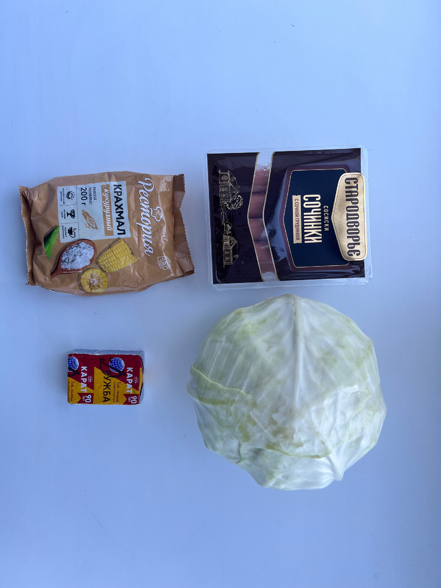 А вот еще одна мечта любителей диет - сосиски в тесте без теста, от которых не толстеют! Вместо булочки или толстого слоя дрожжевого теста - «блинчики» из капусты с яйцом. Они, кстати, сами по себе очень вкусные, можно вполне обойтись без сосисок, просто смазав их соусом. Попробуйте предложить такой вариант вашим подросткам - они вполне могут оценить! Повторяй за мной и всё получится! Нам понадобятся: •Колбаски для жарки — 4 шт •Капуста белокочанная — 300 гр •Яйцо куриное — 4 шт •Сыр плавленный — 1 шт •Крахмал кукурузный — 3 ст.ложки •Масло растительное для жарки •Соль по вкусу •Перец по вкусу •Кетчуп для подачи 1. Для приготовления сосисок «в тесте» предварительно разогрейте духовку до 100°С. Застелите противень пергаментом. У меня не было, поэтому я взяла фольгу. Очень тонко нашинкуйте капусту, посолите и слегка пожмите руками. Оставьте на 10 мин 2. Наколите колбаски/сосиски (чтобы не лопнули) и обжарьте в минимальном количестве масла со всех сторон - колбаски почти до готовности