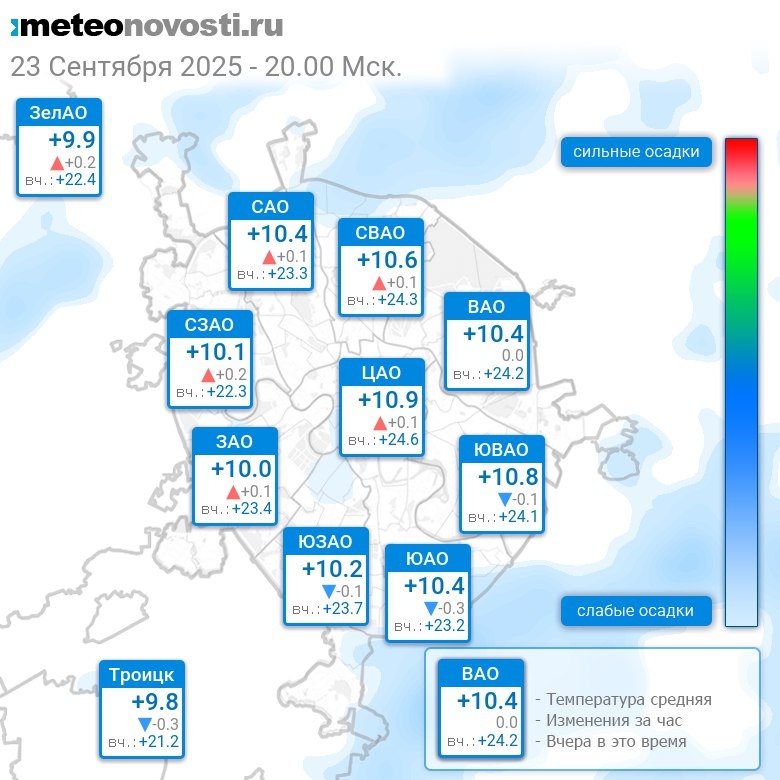 В 20:00 в Москве было от +9.1°C до +11.3°C, средняя температура +10.4°C #погода #Москва #осень #температура #23сентября #вторник