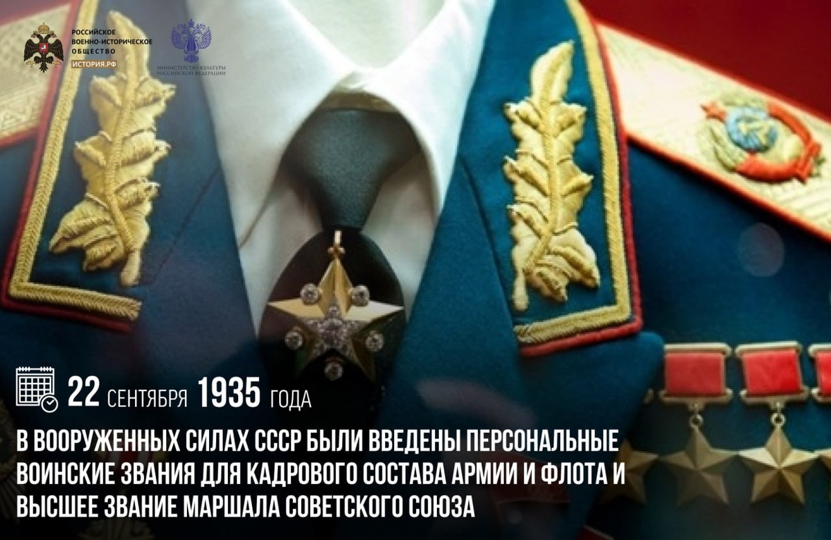22 сентября 1935 года в Вооруженных силах СССР были введены персональные воинские звания для кадрового состава армии и флота и высшее звание Маршала Советского Союза После Октябрьской революции советская власть упразднила все дореволюционные чины, звания и титулы. На практике это привело к негативным последствиям: отсутствие четкой системы званий затрудняло определение субординации между военнослужащими. Вскоре руководство страны было вынуждено постепенно вернуться к использованию элементов прежней системы. Первое присвоение высшего воинского звания Маршала Советского Союза состоялось в 1935 году. Его были удостоены сразу пять военачальников: народный комиссар обороны Клим Ворошилов, начальник Генерального штаба РККА Александр Егоров, а также три прославленных полководца Гражданской войны — Василий Блюхер, Семен Буденный и Михаил Тухачевский. #памятныедаты_ИсторияРФ Подписаться на История.РФ