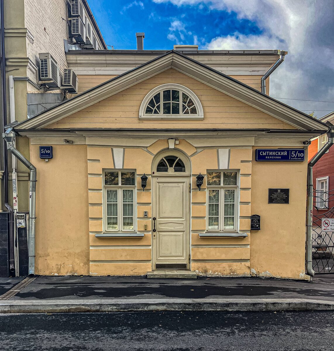 🏛️ Флигель и службы городской усадьбы А.П. Сытина 📍 Адрес: г. Москва, Сытинский пер., д. 5/10, стр. 1 🎭 Охранный статус: Объект культурного наследия регионального значения Усадебный комплекс, расположенный в Сытинском переулке, носит имя бригадира Измайловского полка Андрея Петровича Сытина, чья фамилия дала название переулку. Главный дом усадьбы был построен в 1804 году и является уникальным образцом московской деревянной архитектуры, пережившим пожар 1812 года . Флигель и службы (строение 1) являются неотъемлемой частью этого исторического ансамбля. Ключевые характеристики объекта (согласно предмету охраны): · 📐 Архитектура: Одноэтажное здание с цокольным этажом и мезонином, датированное 1836 годом. Его объемно-пространственная композиция и оформление фасадов характерны для первой трети XIX века . · 🎨 Детали: Композиция фасадов включает замковые камни над окнами, треугольный фронтон с полуциркульными окнами и деревянные наличники мезонина. Материалами отделки выступают белок