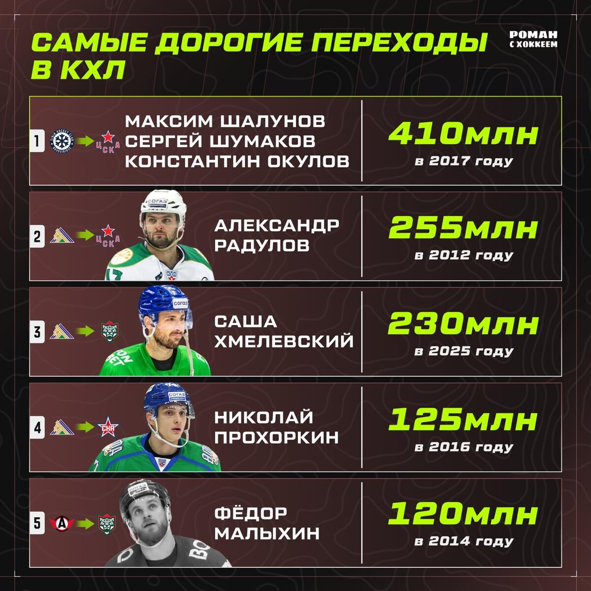 Переход Саши Хмелевского из «Салавата» в «Ак Барс» взлетает в топ-3 самых дорогих сделок в истории Лиги: Из «Сибири» в ЦСКА — Максим Шалунов, Сергей Шумаков и Константин Окулов — 410 млн рублей в 2017 году Из «Салавата Юлаева» в ЦСКА — Александр Радулов — 255 млн рублей в 2012 году Из «Салавата Юлаева» в «Ак Барс» — Саша Хмелевский — 230 млн рублей в 2025 году Из «Салавата Юлаева» в СКА — Николай Прохоркин — 125 млн рублей в 2016 году Из «Автомобилиста» в «Ак Барс» — Фёдор Малыхин — 120 млн рублей в 2014 году Если ты помнишь ещё какой-то крупный трансфер, пиши в комментариях!