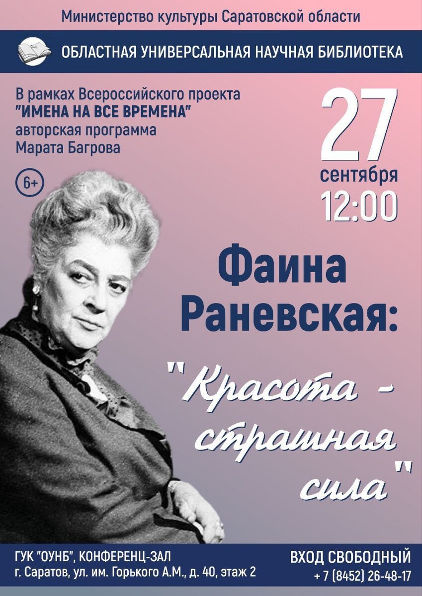 В рамках Всероссийского проекта «Имена на все времена» в библиотеке состоится литературно-музыкальная гостиная «Фаина Раневская. “Красота страшная сила”». Автор и ведущий программы, региональный координатор проекта Марат Багров расскажет интересные факты из жизни легендарной актрисы Фаины Георгиевны Раневской. Зрители совершат увлекательное путешествие в город Таганрог, где родилась актриса. В музыкальной части программы выступят бессменные участники Всероссийского проекта «Имена на все времена» Лолита Завирайко и Сергей Михалёв, которые исполнят шлягеры прошлых лет. 📆27 Сентября ⏲12:00 🎈Областная универсальная научная библиотека ул. им. Горького А. М., зд. 40 Вход свободный