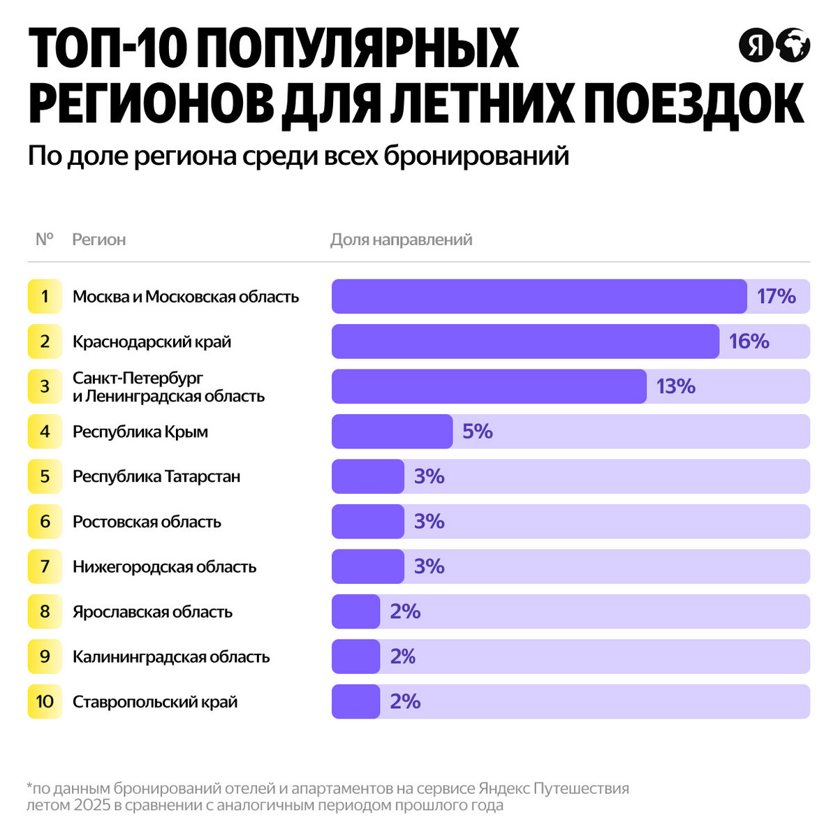 Данные сервиса Яндекс.Путешествия подтверждают исследования других сервисов, проведенные ранее и отчитавшихся о бронированиях туров, отелей и авиабилетов. В отчетах фигурировали и Санкт-Петербург, и Краснодарский край, и Калининградская область, вошедшая в ТОП-10 летних путешествий.