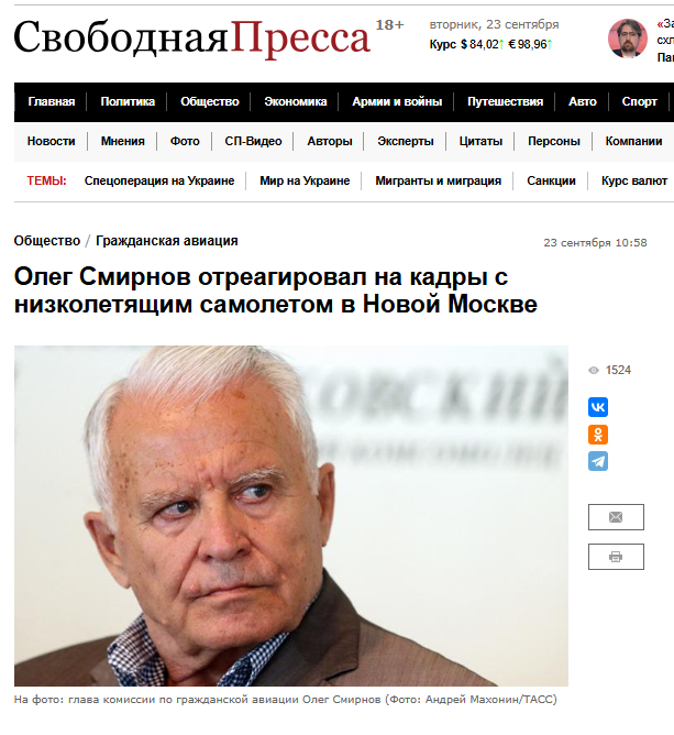 Член Общественного совета Ространснадзора Олег Смирнов отреагировал на кадры с низколетящим самолетом в Новой Москве. Свободная пресса,23.09
