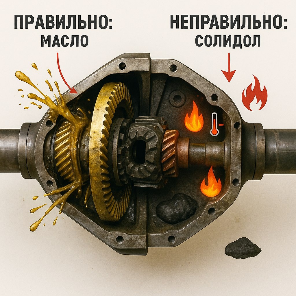 Разбираем критически важный нюанс. Кто привык к самостоятельному обслуживанию техники, до сих пор бытует мнение, что редуктор переднего (и заднего) ведущего моста можно смазывать густыми пластичными смазками – такими как литол или солидол. Аргументация проста: «дешево, и не течет». Однако эта кажущаяся экономия и простота – прямой путь к дорогостоящему ремонту. Давайте разберемся, почему производители единогласно предписывают заливать именно трансмиссионное масло, и к чему приводит нарушение этого правила. Принцип работы редуктора: не просто смазка, а отвод тепла и создание масляной пленки. Редуктор ведущего моста – это сложный узел, где главная пара шестерен (коническая или гипоидная) работает в режиме высоких нагрузок и скоростей. Задачи смазочной жидкости здесь многогранны: 1. Создание прочной масляной пленки. Гипоидное зацепление характеризуется значительным проскальзыванием зубьев. Масло должно образовывать устойчивую пленку, предотвращающую прямой контакт металла с металлом. Спец