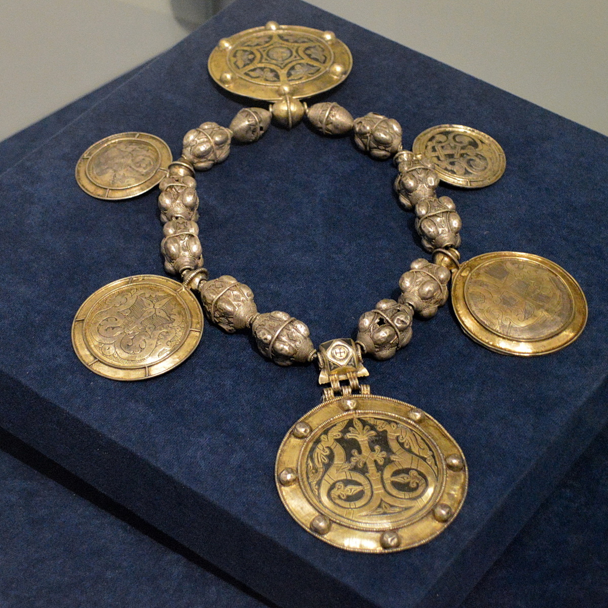 14 августа 1851 года граф Алексей Сергеевич Уваров, археолог и коллекционер, проводил раскопки курганного могильника у села Исады на реке Нерль близ Суздаля. Когда снимали верхний слой земли с курганной насыпи, буквально под дёрном рабочие обнаружили серебряные бляхи-медальоны и бусины, которые позднее получили название «Суздальское оплечье». Сам клад лежал в насыпи древнего кургана, и не относился к погребению. То есть предметы явно представляли собой зарытый отдельно клад, а не инвентарь могильного комплекса. Найденное украшение представляло собой что-то вроде ожерелья, состоящее из 6 позолоченных серебряных медальонов и таких же бусин. Это было парадное украшение шейной зоны, которое в науке получило название «оплечье» (иногда параллельно используются термины «бармы», «бармицы»). Эта уникальная находка датируется 12 началом 13 века. По стилистике, технике оформления (перегородчатая эмаль, чернь на металле), она сопоставима с аналогичными вещами из владимиро-суздальской традиции. Дет