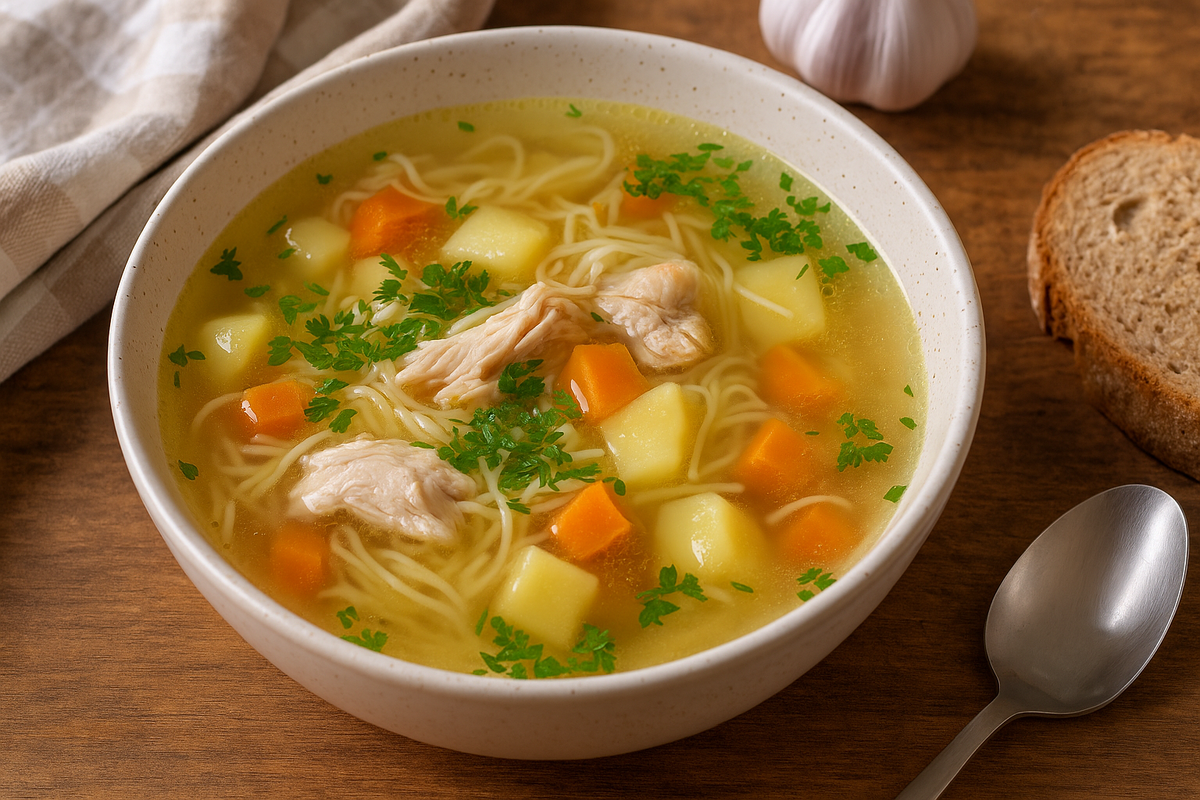 Если вы ищете рецепт простого, сытного и очень домашнего супа — этот вариант именно для вас. Ароматный бульон из куриных бёдер, мягкие овощи, золотистая поджарка и тонкая вермишель «паутинка» создают вкус, который знаком каждому с детства. Начните с мяса. Лучше брать именно куриные бёдра, а не грудку — они сделают бульон более насыщенным, а мясо останется сочным. Курицу промойте, залейте водой и варите до готовности. Чтобы бульон был прозрачным, снимайте пенку, которая образуется в процессе. Готовое мясо аккуратно отделите от костей и верните обратно в кастрюлю. Картофель нарежьте небольшими кубиками. Чтобы все кусочки сварились равномерно, старайтесь делать их одинакового размера. Добавьте картошку в бульон и варите до полуготовности. Пока картофель готовится, займитесь поджаркой. На сковороде разогрейте немного растительного масла. Обжарьте лук, нарезанный мелким кубиком, до золотистой корочки. Затем добавьте морковь, натёртую или нарезанную кубиками, и жарьте ещё пару минут. Для бо