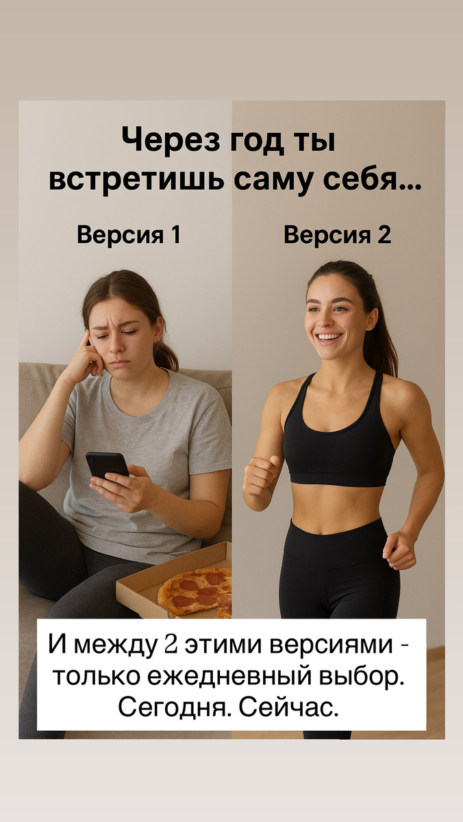 😑Первая — ты снова откладываешь тренировки “с понедельника”. Ещё один год усталости, спешки, дивана, быстрых перекусов на бегу. В зеркале — всё то же лицо, только чуть более уставшее. В душе — сожаление, что время ушло, а ты ничего не поменяла. 🥰Вторая — ты не ждала понедельника. Ты делала маленькие шаги: по 20 минут зарядки, чуть больше воды, немного дисциплины. И вот через год ты другая: бодрая, энергичная, тело подтянуто, глаза сияют. Ты гордишься собой, потому что смогла.