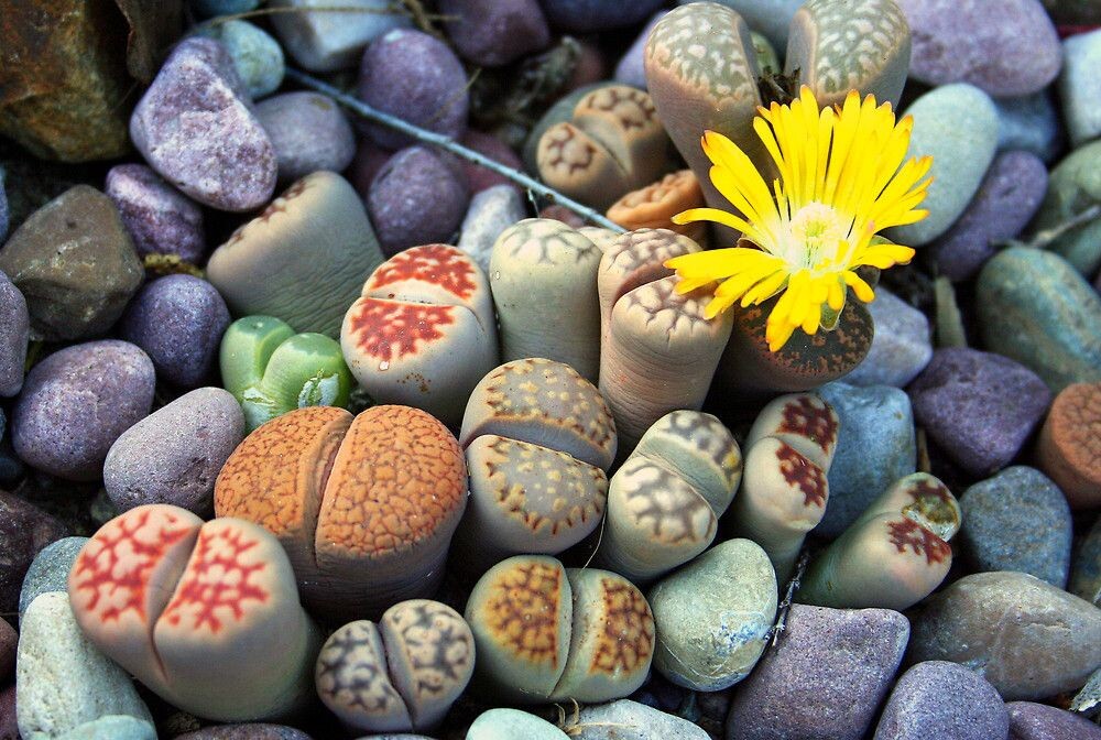 А теперь представьте себе растения, которые выглядят как обычные камни. Это литопсы, или "живые камни". Они растут в пустынях и так искусно маскируются под окружающую местность, что их очень трудно заметить. Их листья толстые и мясистые, похожие на гладкие камешки. Такая маскировка помогает им защититься от животных, которые любят полакомиться зеленью, и сохранить драгоценную влагу.