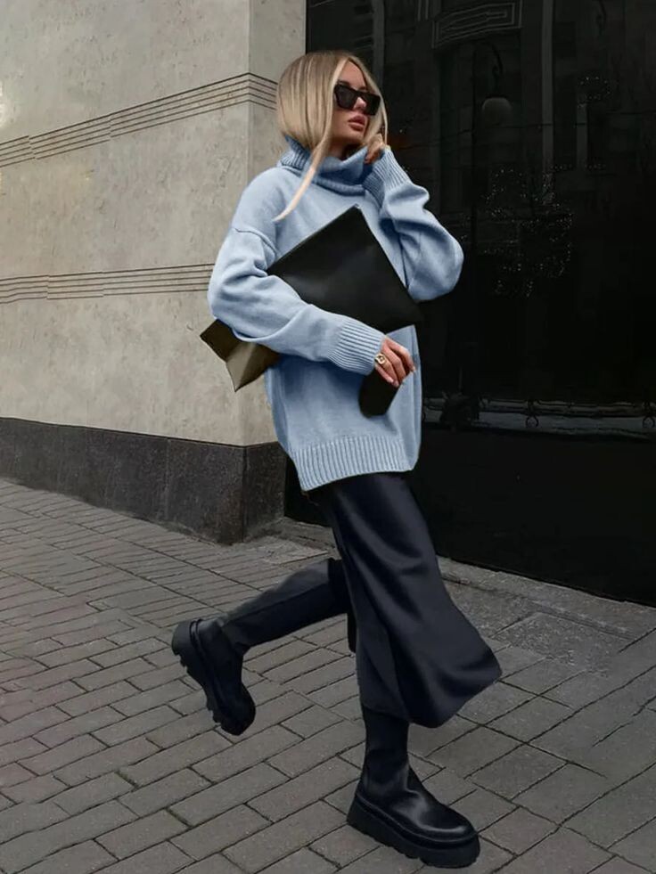 - Важно: Длина должна доходить до середины бедра. Слишком длинный прямой свитер может «съесть» рост.