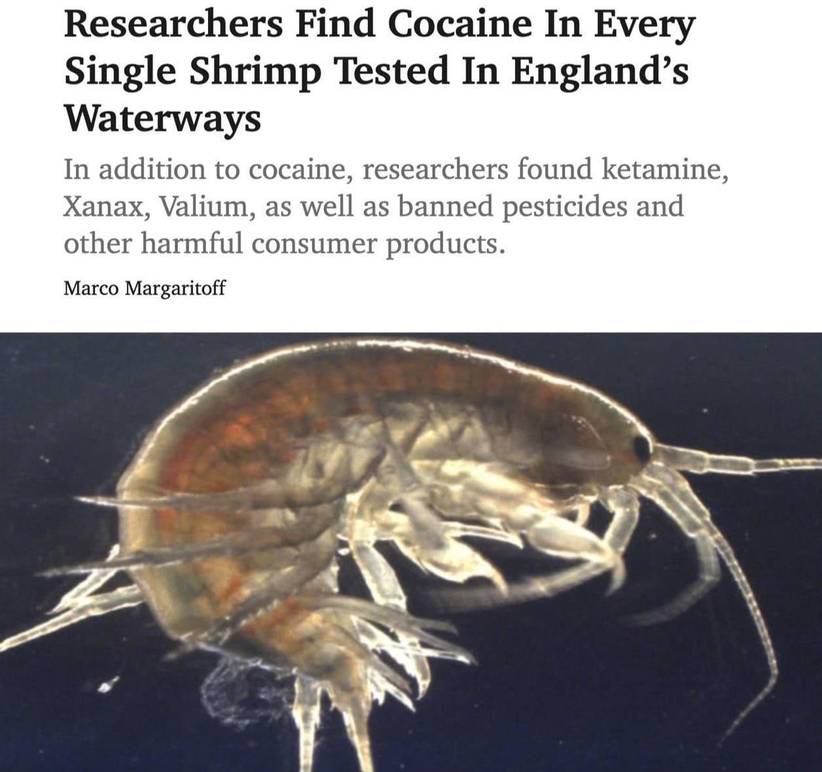 Кокаин обнаружили во всех креветках, выловленных для проб в английских водоёмах Британские исследователи проверяли воду на загрязнения и неожиданно нашли в почти каждой креветке следы кокаина, а также кетамина, ксанакса, валиума, запрещённых пестицидов и других вредных веществ. Теперь учёным предстоит выяснить, насколько это опасно для экосистемы и как с этим бороться.