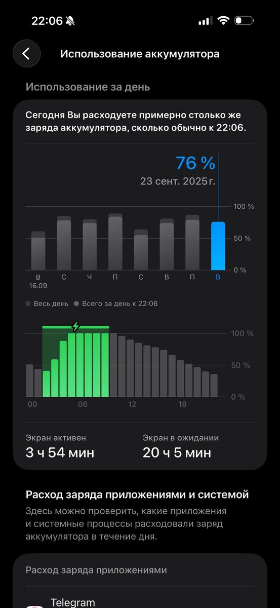 Вот и статистика iOS 26 Beta 1 по аккумулятору.